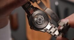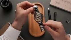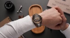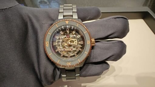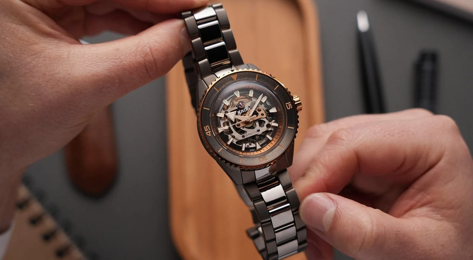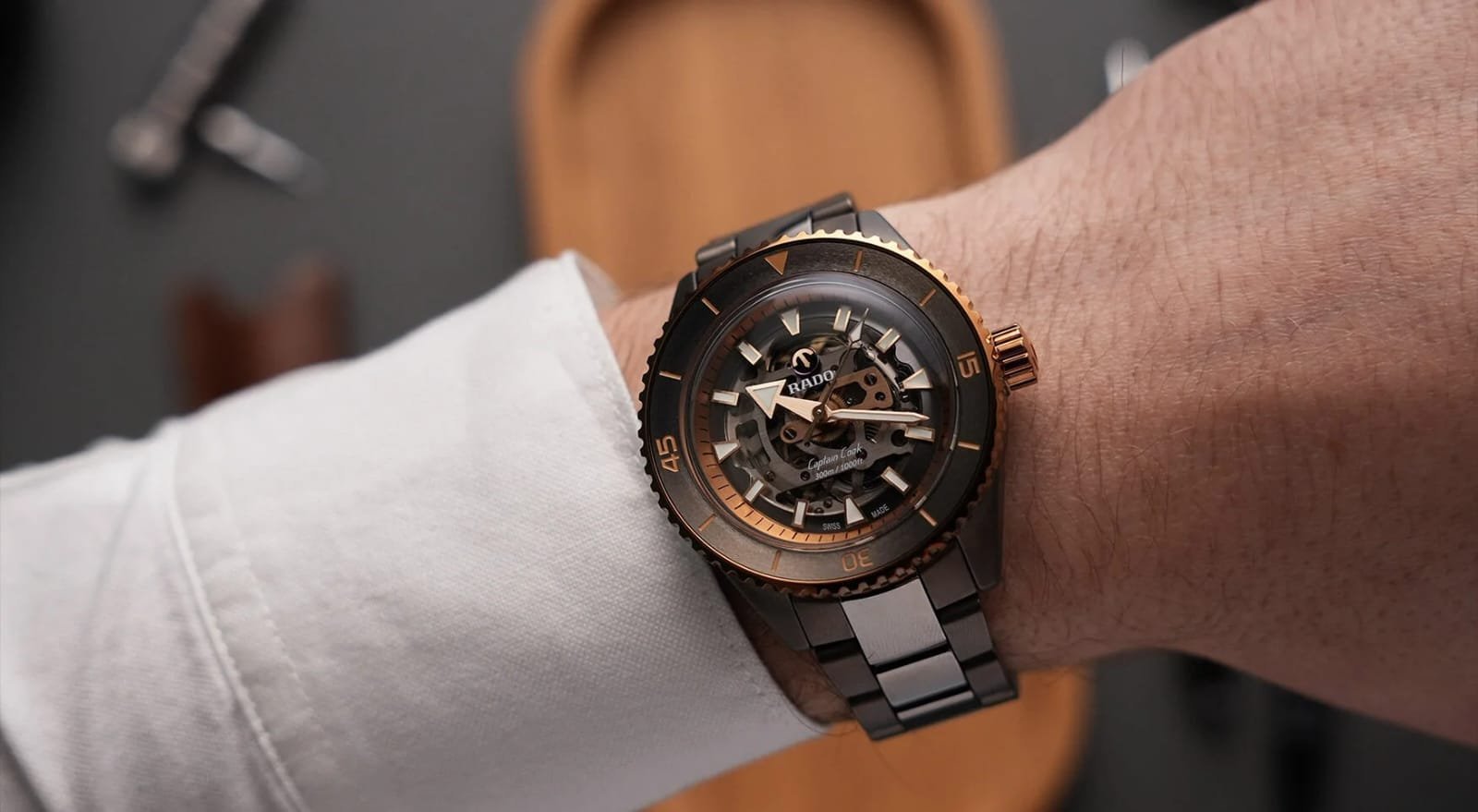 The image shows a close-up of a Rado Captain Cook High-Tech Ceramic Skeleton men’s watch, specifically the model R32192152. This watch features a skeletonized dial, allowing a view of the intricate inner workings, and is encased in high-tech ceramic with rose gold PVD accents on the bezel and crown.